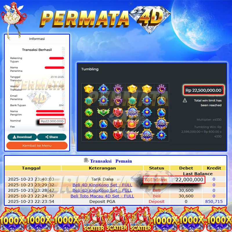 PERMATA4D JACKPOT STARLIGHT PRICESS 1000 Rp. 22.500.000,- LUNAS